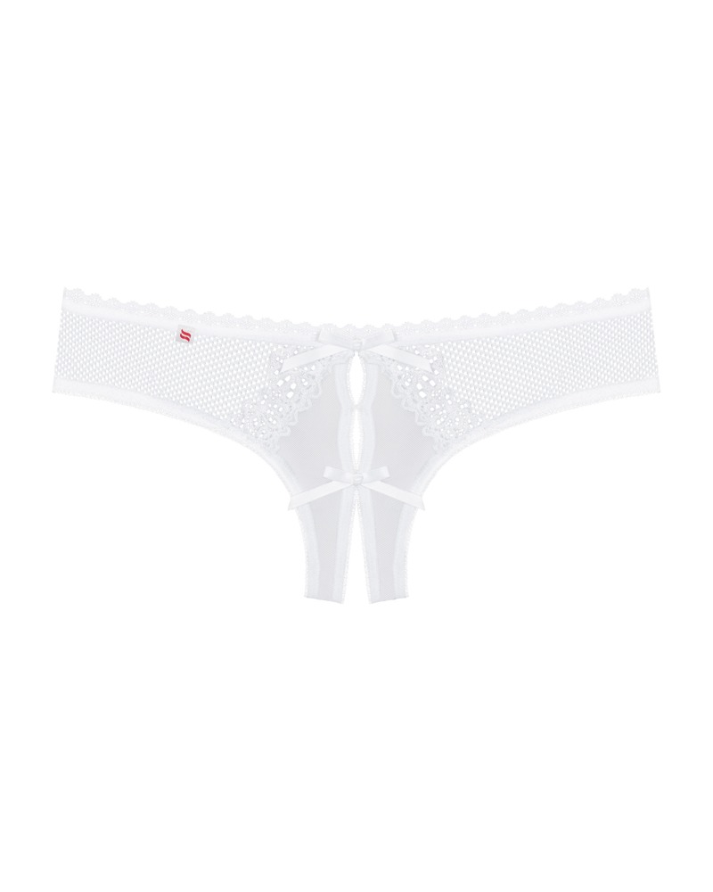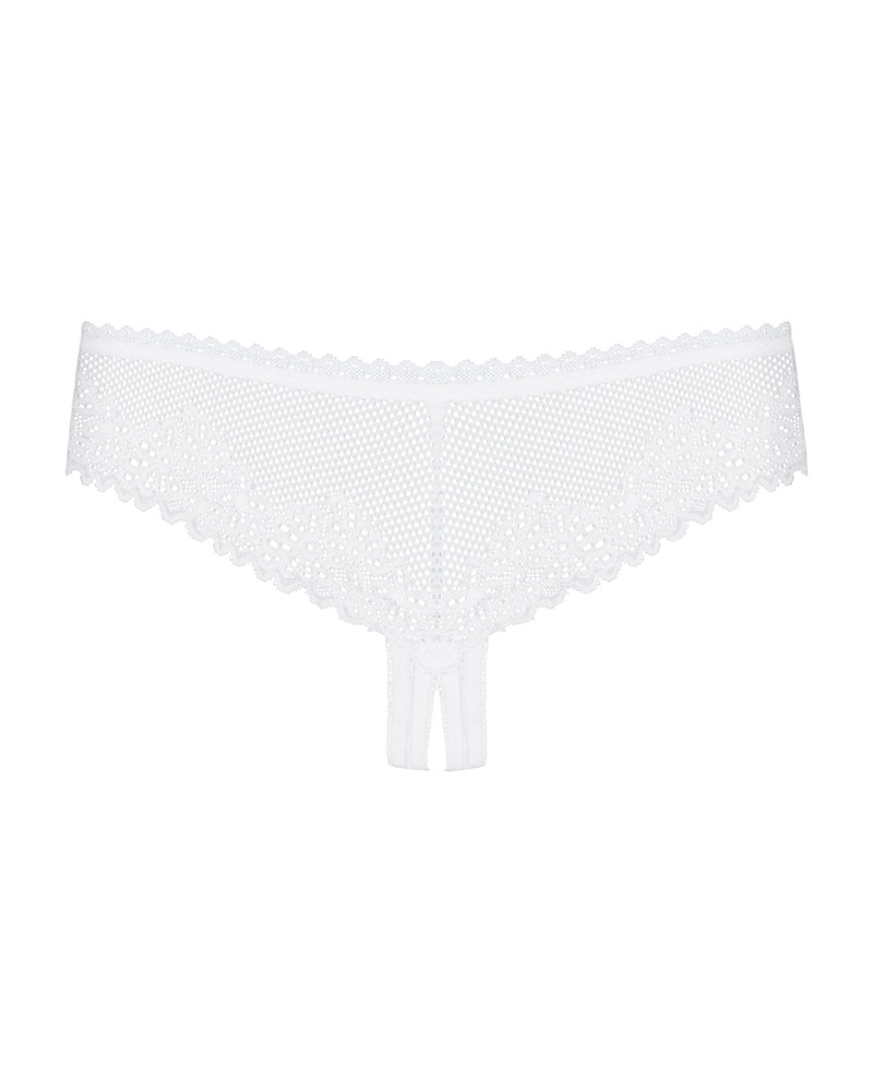 Witte transparante kruisloze string Alabastra van Obsessive gemaakt van delicate tule, fijn gaas en lieflijk kant. Zacht en elastisch rondom voor volledig comfort. Open kruis aan de voorkant versierd met satijnen strikjes.