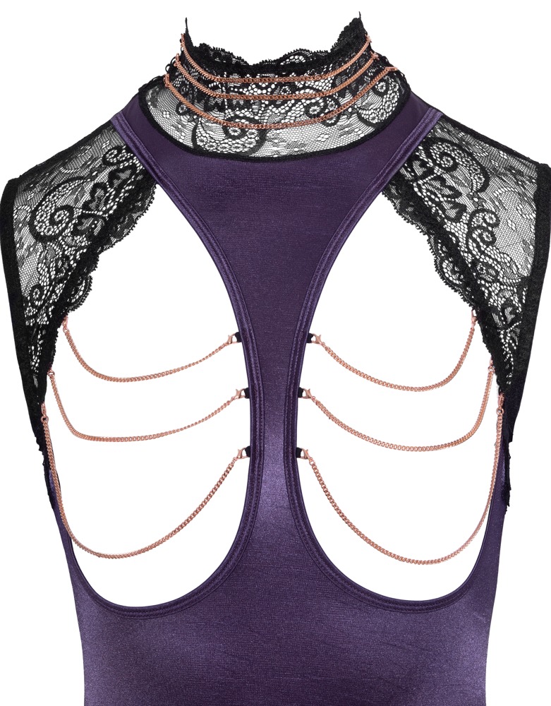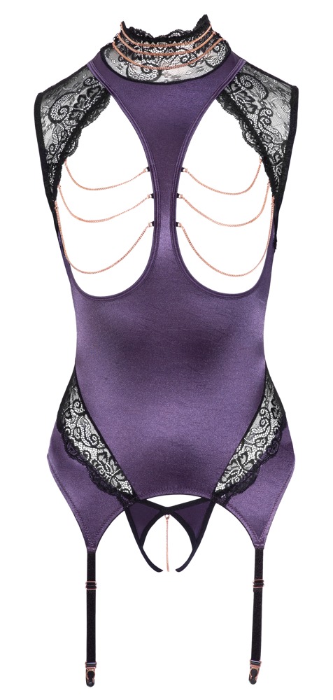 Bust en backless jarretel chemise van Abierta Fina gemaakt van elastisch paars satijn met fijne zwarte kanten inzetstukken en kanten nekband met 2-voudige knoopsluiting. Halsband vooraan versierd met 3 kettingen. De vrije buste en de rug zijn ook versierd met roségoudkleurige kettingen, die allemaal afneembaar zijn dankzij kleine karabijnhaakjes. Aan de achterkant heeft de jarretelle chemise een haaksluiting. De jarretelbandjes zijn in lengte verstelbaar. De bijpassende string heeft een uitnodigend open kruisje met een stimulerende kruisbandketting die ook uitneembaar is.
