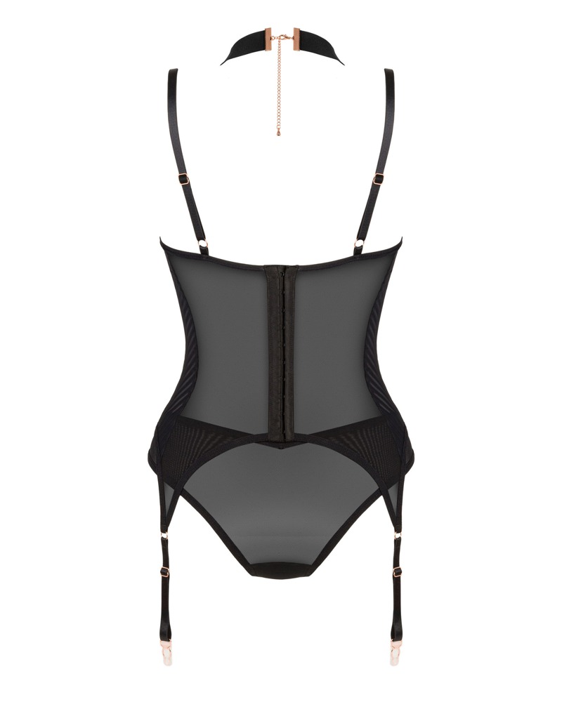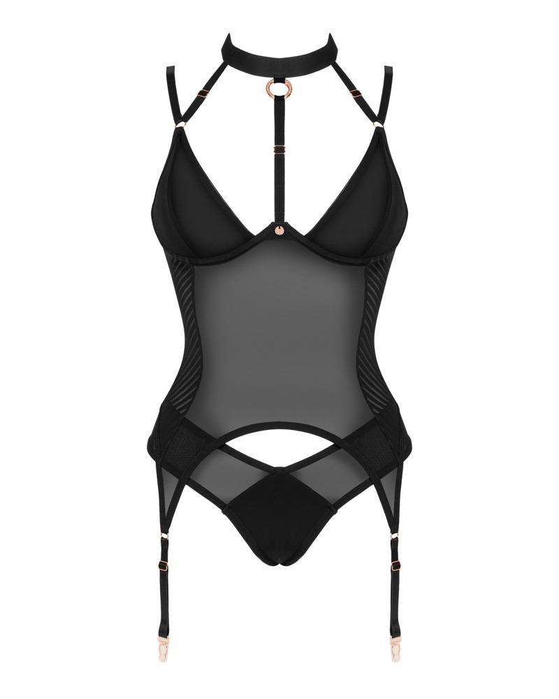Zwarte Brasica set van Obsessive met een jarretel shirt en slip. Delicate, transparante stretch tule met ondoorzichtige details en een figuurflatterende gestreepte look aan de zijkanten. Overal zacht en elastisch voor een hoog draagcomfort. Soepele jarreteltop met beugelcups en stijlvolle, verstelbare bandjes bij de halslijn. Halternek in choker-stijl met verstelbare kettingsluiting in de nek. De bandjes en jarretelbandjes kunnen ook op maat worden versteld. Net als de haakjessluiting op de rug.