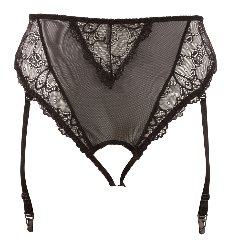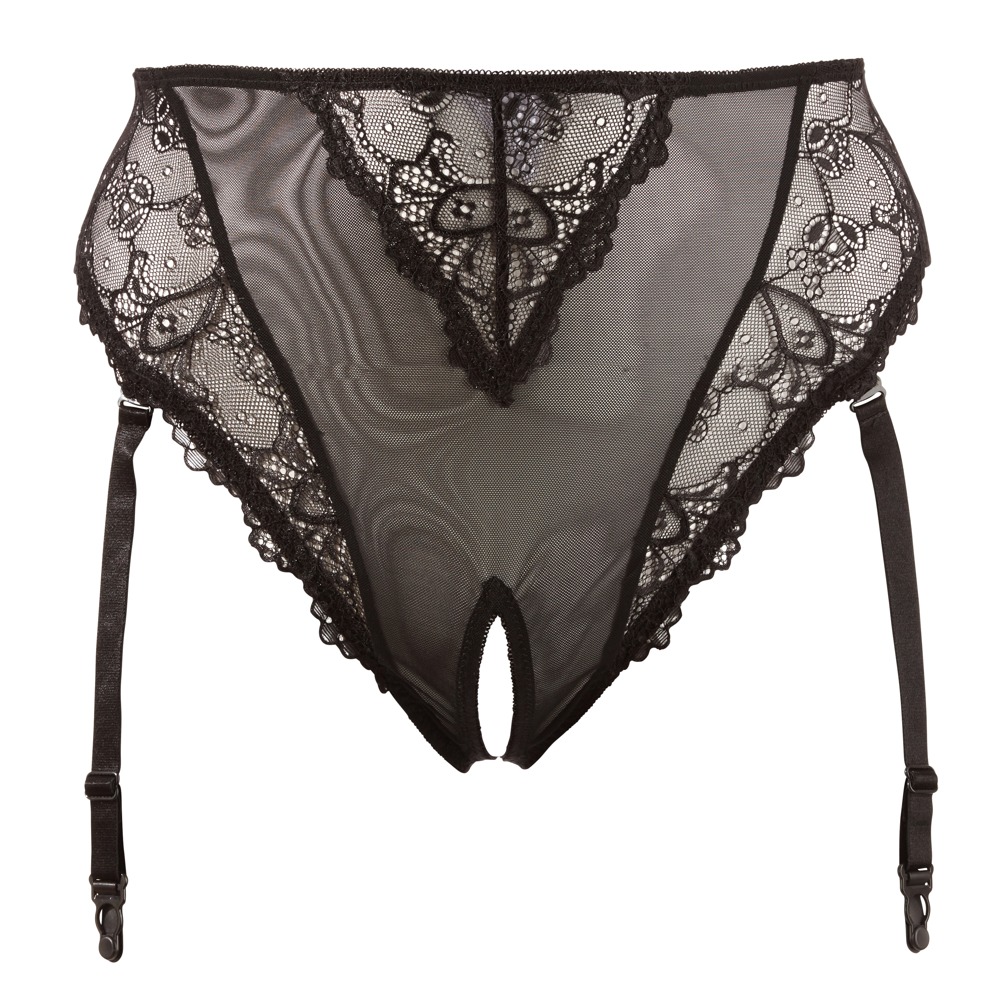 Ouvert jarretel slipje gemaakt van powernet met bloemen kant. De taillehoge snit flatteert de buik en taille. Bretels verstelbaar en afneembaar. Zonder kousen.