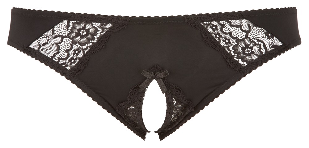 Slipje met elastische inzet van kant aan de voorkant. Het uitnodigende open kruisje wordt geaccentueerd met een brutaal decoratief strikje.