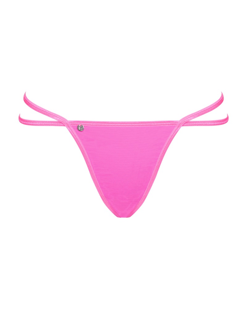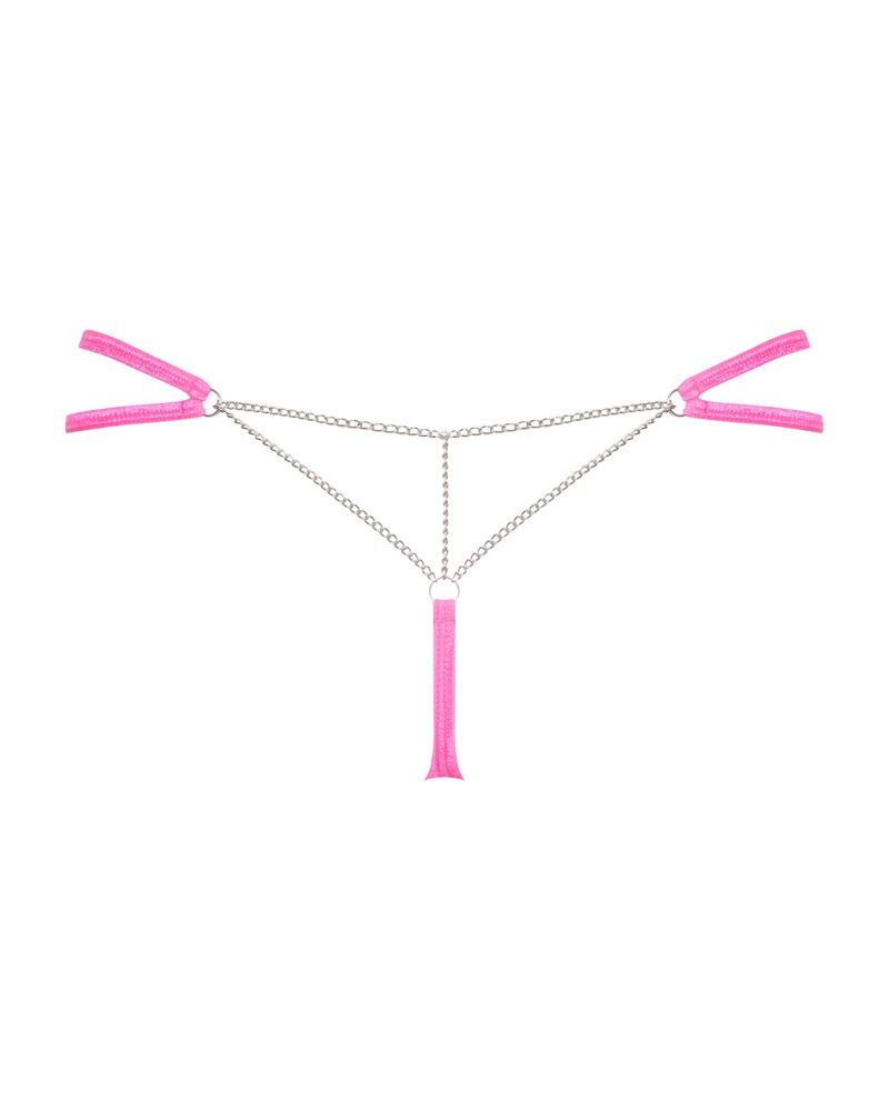 Roze-kleurige Chainty string van Obsessive met decoratieve kettingrand over de billen. Gemaakt van zacht stretchmateriaal met dubbele stretchbandjes als tailleband.