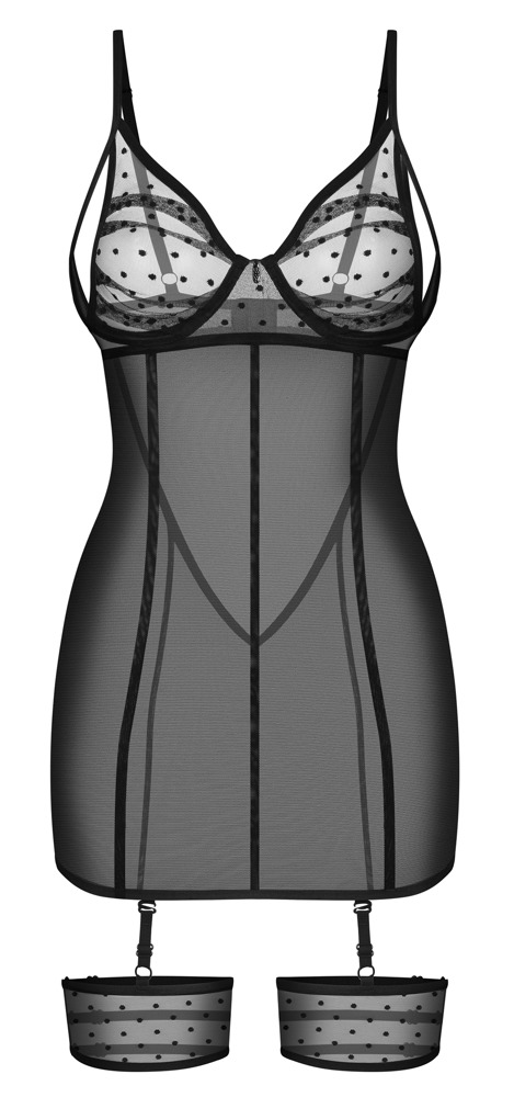 Strak aansluitende Nuites negligé van Obsessive met jarretelbandjes voor en kousenband. Verleidelijke stijl in stijlvolle zwarte transparantie, modieuze stippen voegen stijlvolle accenten toe. Overal zacht en elastisch voor een hoog draagcomfort. Negligé met subtiel juwelendetail tussen de zachte cups. De bandjes en haaksluiting op de open rug kunnen op maat worden versteld. De verstelbare jarretelbandjes met kousenband zijn afneembaar van de negligé.