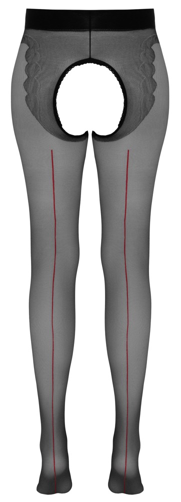 Zijdeachtige jarretellebroek met uitnodigend open kruis en rode siernaad op de rug. Oekotex-gecertificeerd. 20 den.