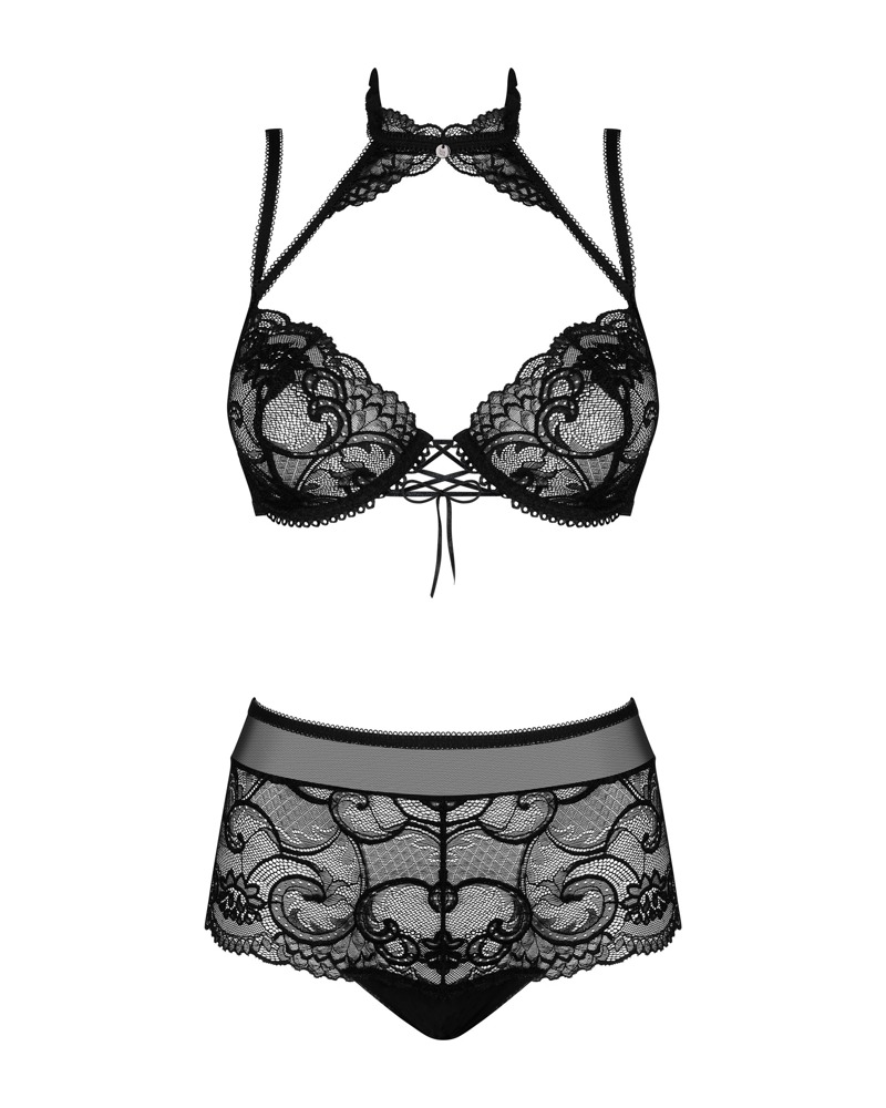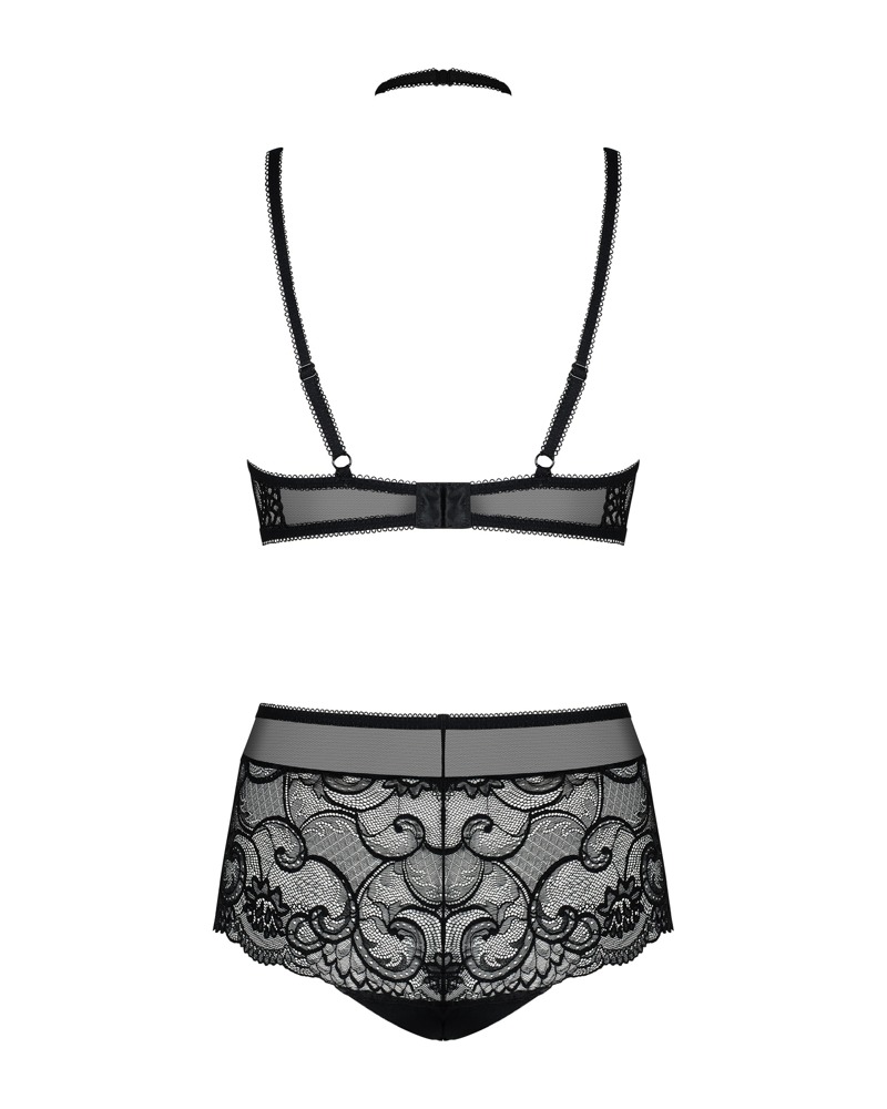 Elizenes setje van Obsessive met een beugelbeha en een slip met hoge taille. Gemaakt van fijn zwart kant – overal zacht en elastisch voor een hoog draagcomfort. Beugelbeha met flirterige vetersluiting tussen de cups, nekband met clipsluiting. De bandjes en haaksluiting op de rug zijn verstelbaar. De comfortabele slip met hoge tailleband is ondoorzichtig in het kruis.