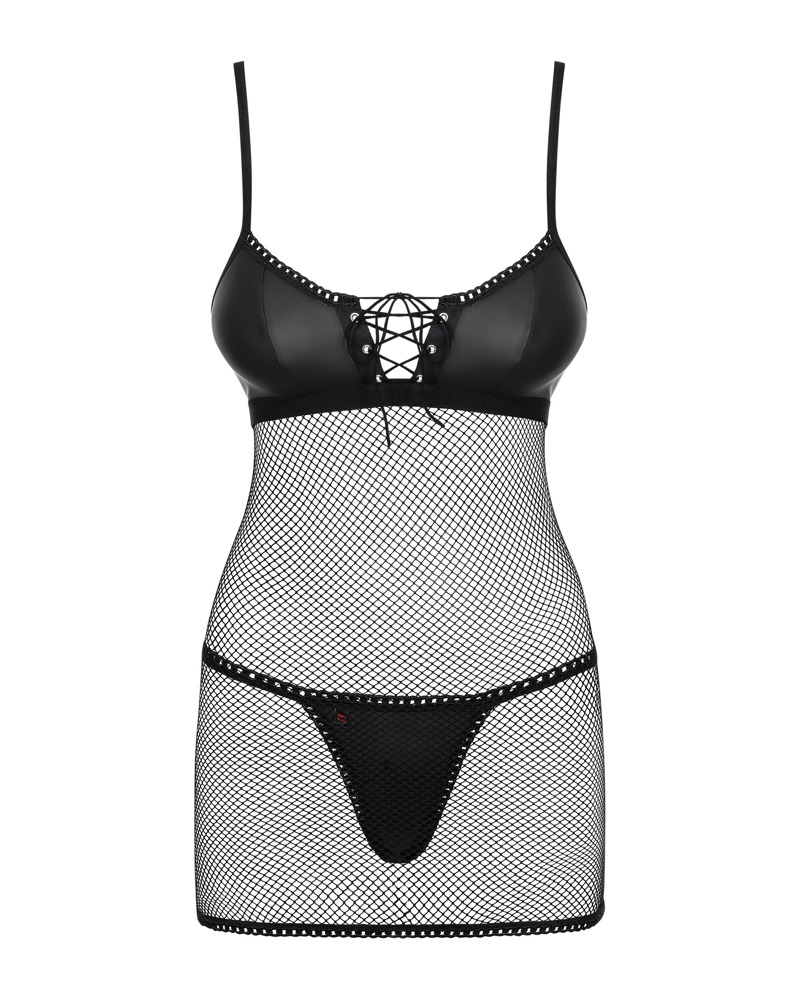 Zwart Redella setje van Obsessive met een aansluitende negligé en bijpassende string. Gemaakt van zacht elastisch mesh en ondoorzichtig stretchmateriaal in lederlook. Met kleine vetersluiting tussen de cups. Haaksluiting aan de achterkant. De bandjes zijn verstelbaar.