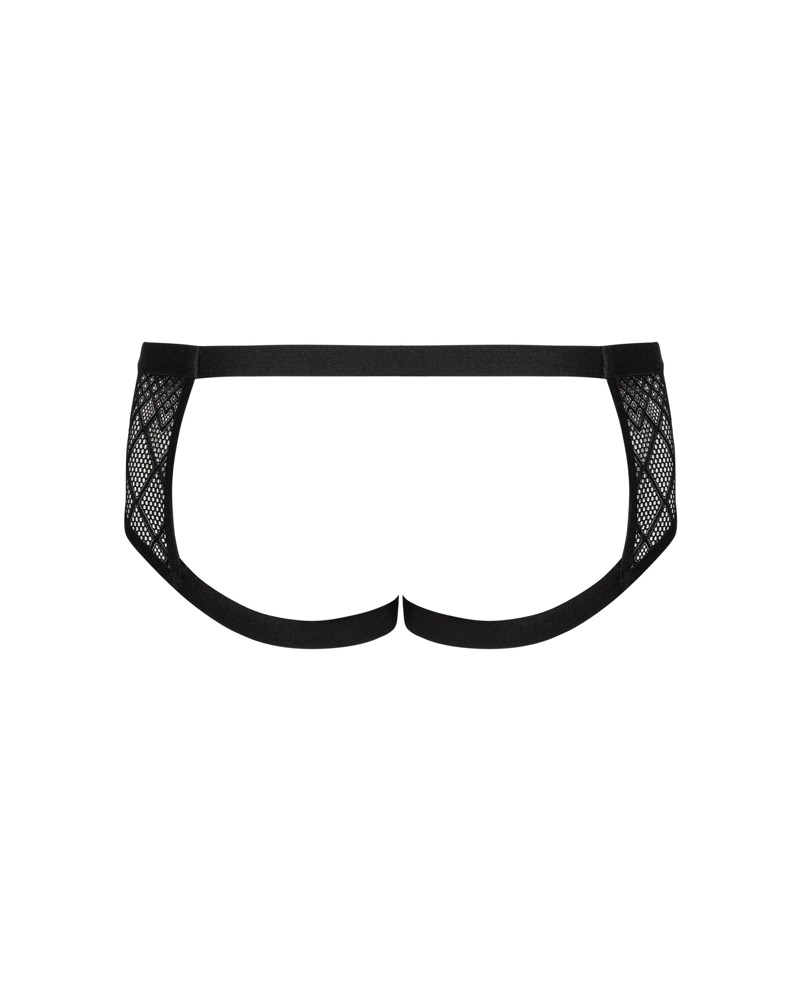 Zwarte jock Severio van Obsessive in extravagant transparant patroon met een ondoorzichtig zakje eronder. Zacht en elastisch voor volledig comfort. Comfortabele elastische tailleband met een klein metalen element aan de voorkant. Comfortabele jockbandjes laten de bips spannend vrij, duwen en benadrukken.