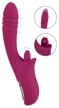 Trilt, tongt en stoot keer op keer!nDe handige Licking & Thrusting vibrator van Javida verwent zowel van binnen als van buiten! De zachte vibro-tong beweegt heen en weer en verwent de clitoris intensief. En tegelijkertijd stimuleert de herhaaldelijk stuwende mollige vibro-tip de vagina diep. Dubbel orgastisch plezier met één druk op de knop!nn3 stille, krachtige motoren leveren betrouwbare kracht voor dubbele stimulatie. De vibrerende zachte tong beweegt heen en weer op 10 selecteerbare snelheden. De stuwende functie van de vibrerende schachtpunt kan ook gemakkelijk worden geregeld in 10 standen met een druk op de knop. Voor onmiddellijke kracht start de vibrator in turbostand met de twee sterkste standen. De lik- en duwfuncties kunnen dan intuïtief apart worden geregeld met één druk op de knop.nnDe realistische vibrator is gemaakt van siliconen met een zijdezacht oppervlak, is gemakkelijk in te brengen en glijdt als vanzelf. Hij is licht flexibel en past zich perfect aan aan het lichaam en de bewegingen tijdens het spelen. Maximaal comfort voor allround verwennerij!nnOplaadbaar – USB-oplaadkabel inbegrepen. nnTotale lengte 21,5 cm – 22,5 cm; inbrenglengte 12 cm – 13 cm, Ø max. 3,2 cm.nGewicht 197 g. nSiliconen, PU, ABS.