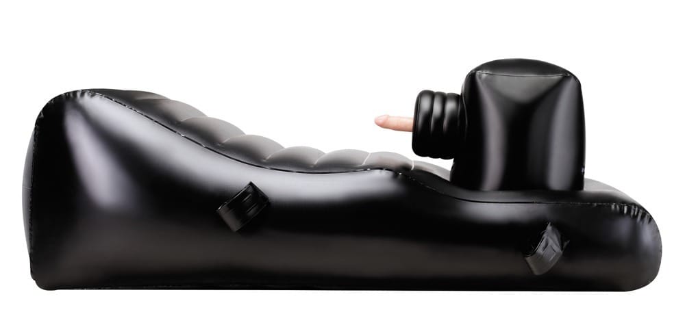 De ultieme seksmachine!nDe opblaasbare behuizing voor het stuwapparaat is stevig geplaatst aan het voeteneinde van het opblaasbare, anatomisch gevormde ligbed. Er zit een adapter voor een van de drie bijgeleverde vibrators in het stuwapparaat. Jij (of je partner) kan de stuwfunctie gemakkelijk in- en uitschakelen met de handige, draadloze afstandsbediening – ongeveer 200 stoten per minuut! Afmetingen ligbed: opgeblazen 160 cm lang, 80 cm breed, hoogte hoofdgedeelte 50 cm, hoogte voetengedeelte 25 cm. Kleur: zwart. De polsen en enkels kunnen worden vastgezet met stevig geplaatste boeien voor extra speciaal bondage plezier! Kan tot 150 kg dragen. Afmetingen vibrator: Roze G-spot vibrator 12 cm lang, Ø 3 cm. Penisvibrator 14 cm lang, Ø 3,5 cm. Paars gekleurde penis vibrator 17 cm lang, Ø 3,5 cm-4 cm. Elke gladde vibrator met power vibratie. Vibrators kunnen ook apart gebruikt worden – dan is de vibratie traploos regelbaar. Inclusief batterijen voor de afstandsbediening, reparatieset en blaasbalgje. (Gelieve batterijen apart te bestellen: 8 x Baby, 4 x Mignon)