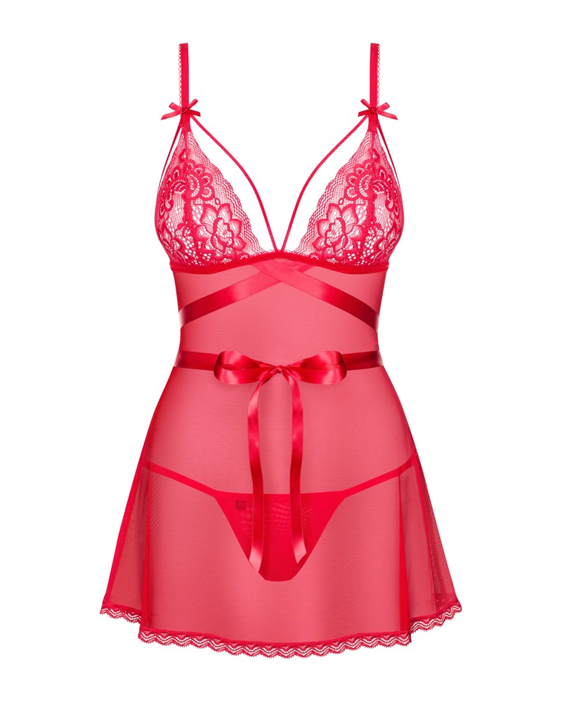 Extra kort uitlopende babydoll en string in de rode Lovlea set van Obsessive. Opwindend transparante babydoll met kanten cups geaccentueerd met bandjes en een satijnen strik in de taille. Overal zacht en elastisch voor een hoog draagcomfort.