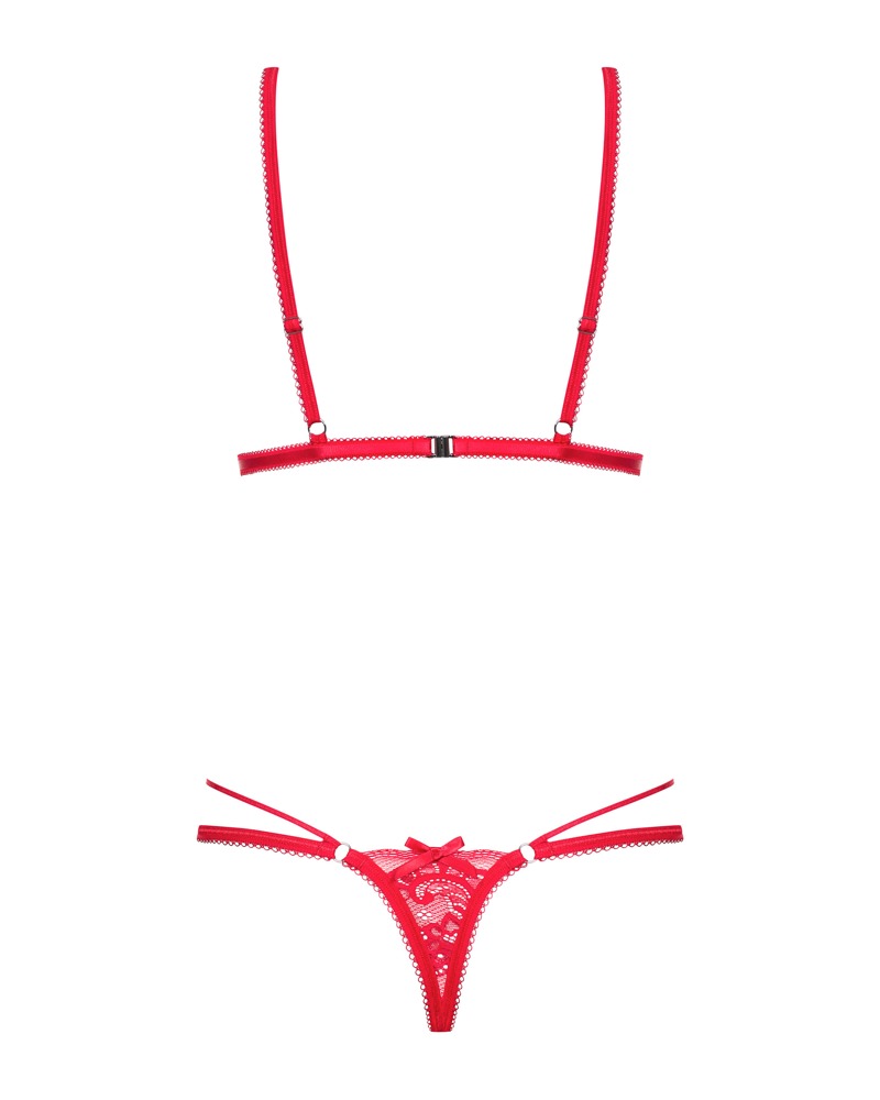 Rode Lovlea stringbody van Obsessive gemaakt van zacht, rekbaar kant. Sensuele, onthullende styling met bandjes en strikversieringen. Tweedelige look aan de achterkant met haakjessluiting. De bandjes zijn verstelbaar.