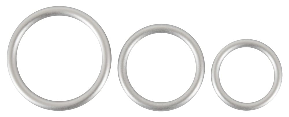 Drie verschillende maten penis/testikelringen in een set. In gevaarlijke metalen look met het comfort en de veiligheid van siliconen. Zeer flexibel zetten ze zich om de penis en testikels heen en zorgen voor steenharde erecties en die bijzonder lang.