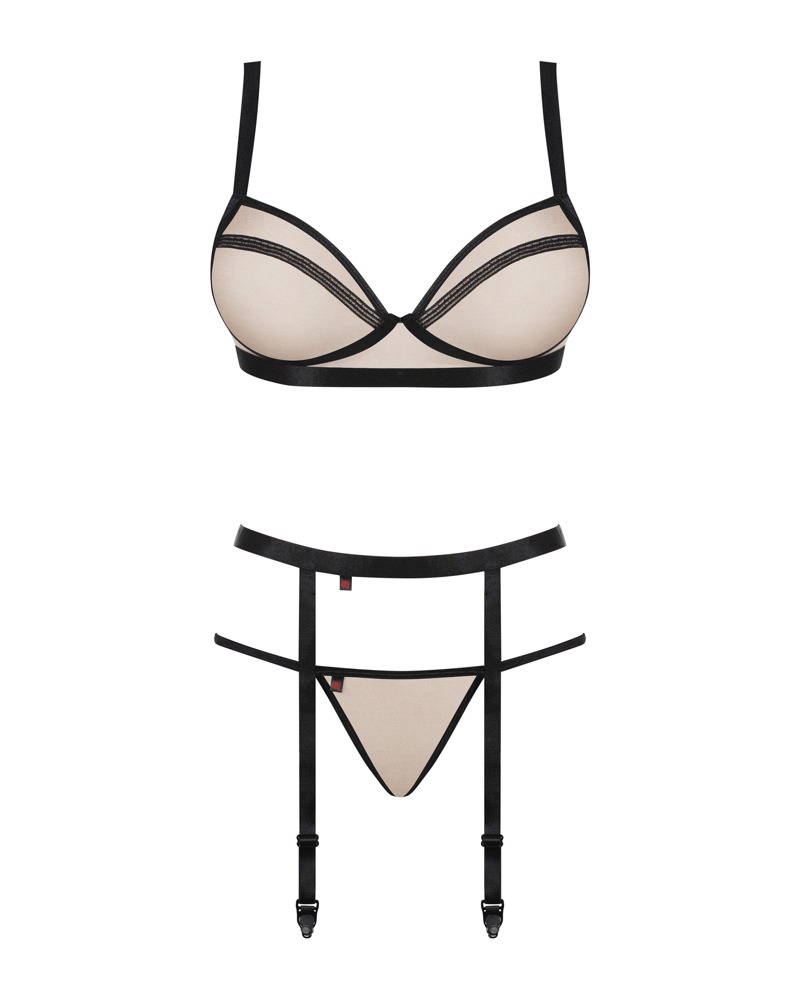 3-Delige jarretelset Nudelia van Obsessive met zachte beha, jarretelgordel en string. Semi-transparant, nude-kleurig stretchmateriaal met een elegante glans. Curve-accentuerende zwarte stretchbandjes als stijlvol contrast. Rondom zacht en elastisch voor een hoog draagcomfort. Bh met verstelbare bandjes en drievoudige haaksluiting achter. Jarretelgordel met verstelbare jarretelbandjes.