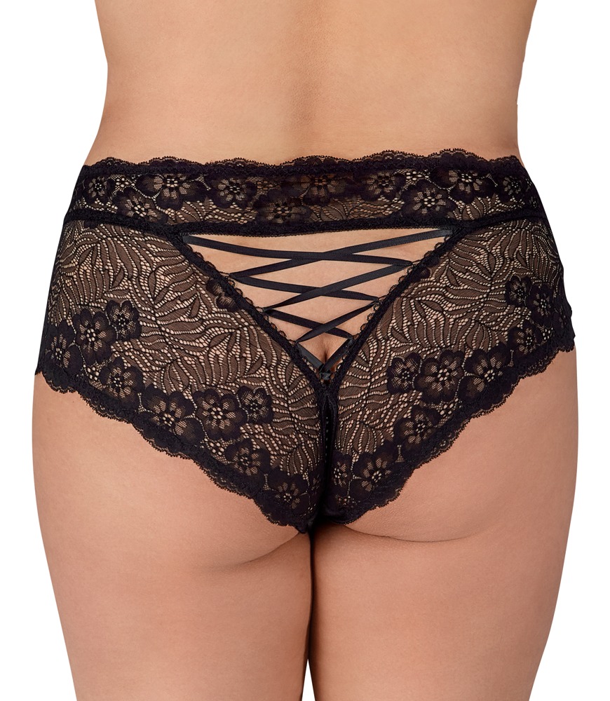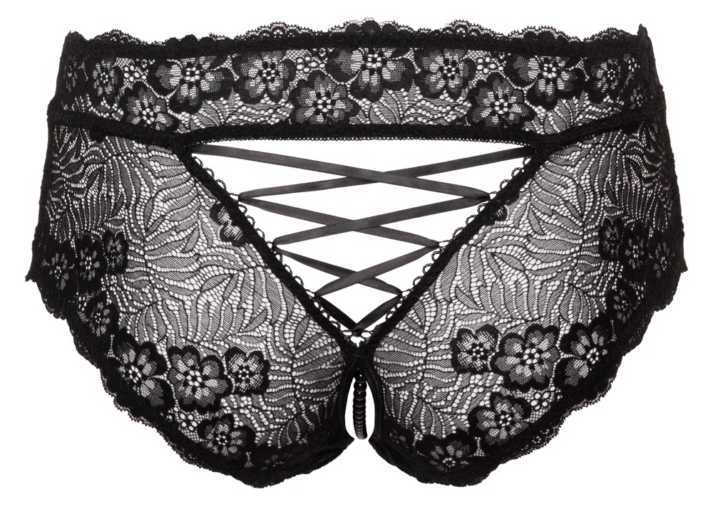 Zwarte kruisloze panty van Cottelli CURVES volledig gemaakt van fijn bloemenkant. Zacht en elastisch voor een goede pasvorm en een hoog draagcomfort. Bijzonder geraffineerd is de elastische, stimulerende parelketting in het open kruis, evenals de satijnen lintveter in de royale driehoekige onderhals.