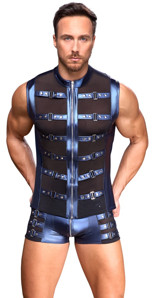 Strakke, accentuerende broek van NEK met een onderliggende ritssluiting in de buidel. In een coole blauwe metallic matte look met bandjes met studs aan de zijkanten. Zwarte transparante powernet inzetstukken onder de bandjes. Zacht, elastisch en met een bedekte elastische tailleband voor maximaal comfort.