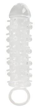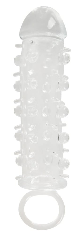 Transparante, zijdezachte penisschede van Crystal Clear met 2 cm verlenging, stimulerende nopjes en testikelring. Ook geschikt voor dildo en vibrator.