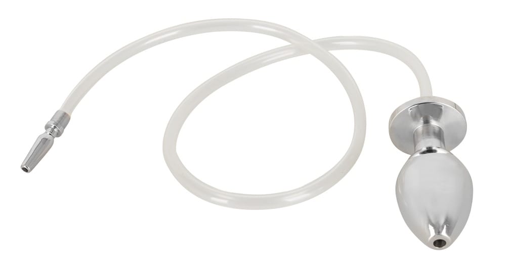 De holle, zware anaalplug wordt via de buis met de open penisplug verbonden. Anaalplug: totale lengte 7,8 cm, Ø max. 3,7 cm, 374 g zwaar; penisplug: 3,3 cm, Ø max. 0,9 cm; buislengte 62 cm. Inclusief vervangende buis in het zwart.