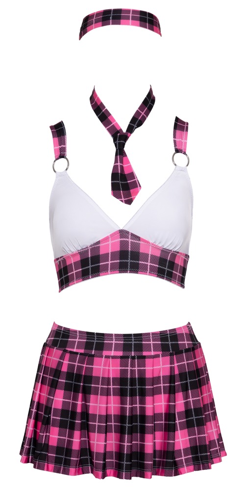 Hoogwaardig 4-delig schooluniform kostuum van Cottelli COSTUMES in roze/zwart/witte ruit look. Bestaande uit topje, geplooide rok, typische stropdas en haarband. Top met witte cups en ringen voor de brede bandjes die op de rug kruisen. Extra kort rokje met comfortabele stretch tailleband.