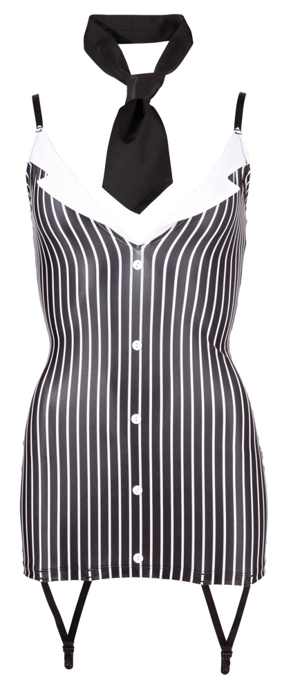 Nauwsluitende mini jurk met verstelbare bandjes en twee jarretels aan de voorkant. Aangezette knopen aan de voorkant en aangegeven kraag bij de diepe halslijn. Inclusief stropdas tot stropdas.