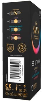 Latexvrije condoom variatie!nCondoommix Selection+ van SKYN met 10 condooms in 4 verschillende smaken: n4 x Originaln2 x Elite (ultradun)n2 x Elite Extra Lubricated (40% meer glijmiddel)n2 x Intense Feel (noppen). nAlle condooms zijn gemaakt van Sensoprene (Poylisoprene): Zijdezacht en aangenaam om aan te raken, latexvrij en geurloos – ideaal voor latexallergieën en -gevoeligheden. Met glijmiddelcoating en reservoir op siliconenbasis. Veganistisch.nnNominale breedte 53 mm. n10 stuks.