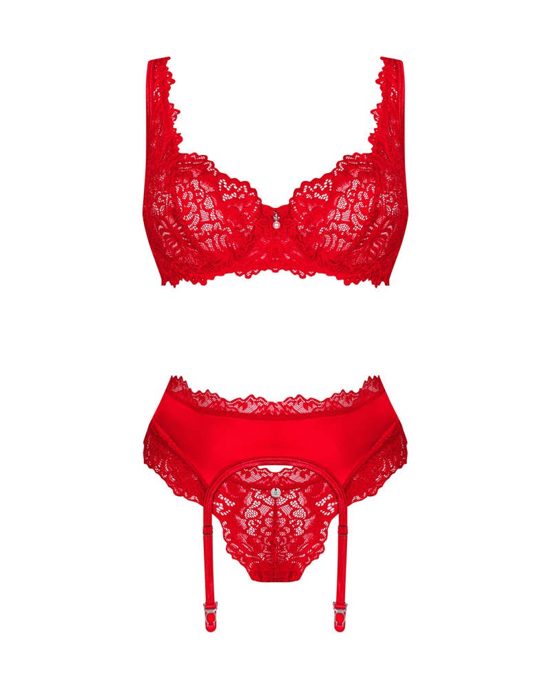 3-delige rode Amor Cherris set van Obsessive met beugelbeha, jarretelgordel en string. Allemaal van fijn transparant kant met stretch satijnen inzetstukken op de jarretelgordel. Overal zacht en elastisch voor een hoog draagcomfort. Beha met decoratief element tussen de beugelcups en verstelbare haakjessluiting op de rug. De bandjes en jarretelgordels kunnen ook op maat worden versteld.