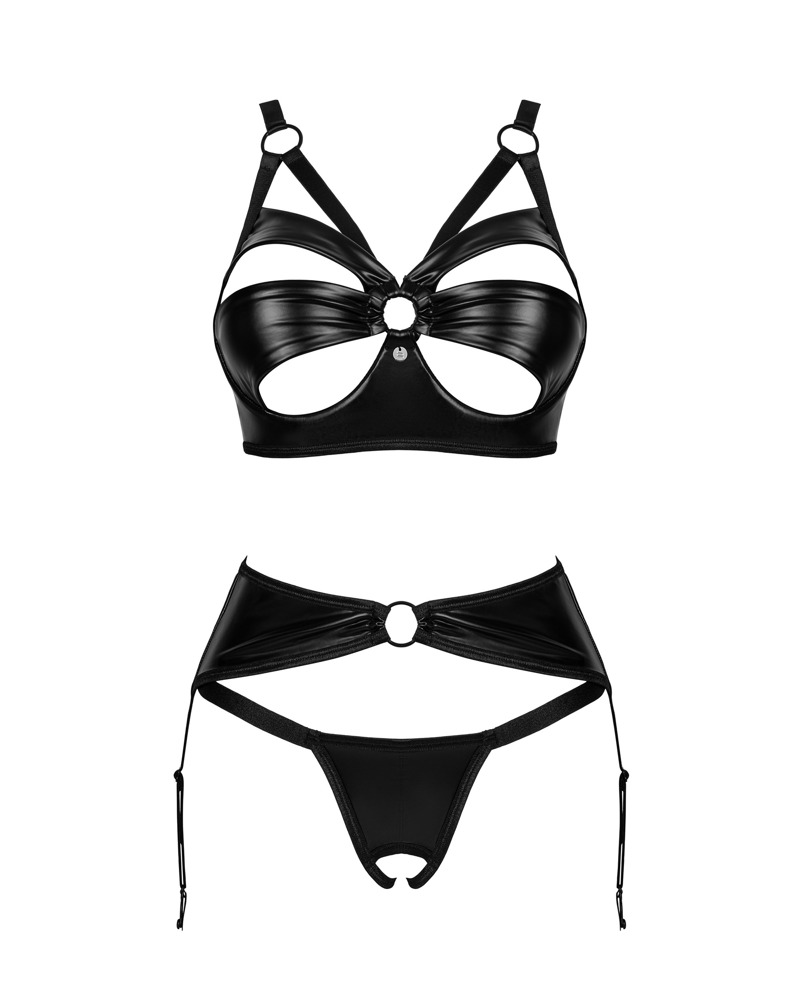 3-delige set Armares van Obsessive met beugelbeha, jarretelgordel en kruisloze string. Geheel in een trendy wetlook die elastisch is en zacht aanvoelt. Cups met verleidelijke uitsnijdingen en klein juwelenelement. De bandjes zijn slim vormgegeven met ringen en kunnen op maat worden versteld – net als de haaksluiting achter. De jarretelgordel heeft een ring aan de voorkant en een verstelbare haaksluiting aan de achterkant. De jarretelbandjes zijn ook verstelbaar. De wetlook string is verleidelijk open bij het kruis