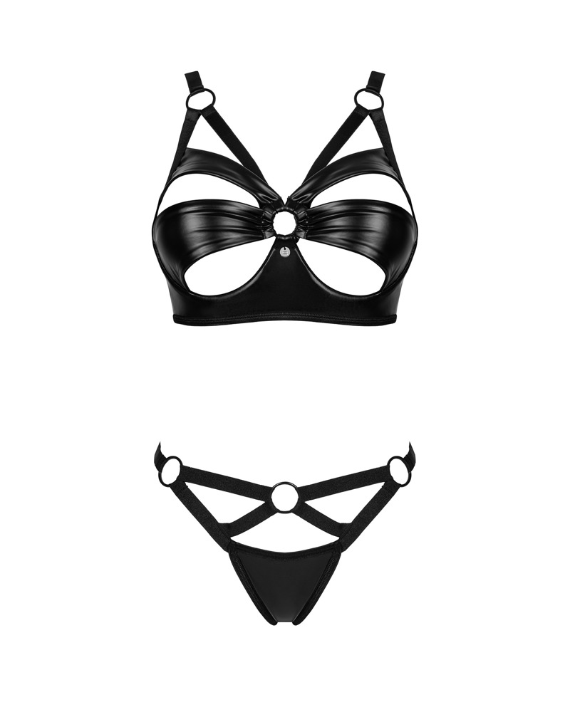 Beugelbeha en bijpassende string in de Armares set van Obsessive. Volledig in een trendy wetlook die elastisch is en zacht aanvoelt. Cups met verleidelijke uitsnijdingen en klein juwelenelement. De bandjes zijn slim gestyled met ringen en kunnen op maat worden versteld – net als de haaksluiting aan de achterkant. De wet-look string is afgewerkt met zachte stretch bandjes en sierringen.