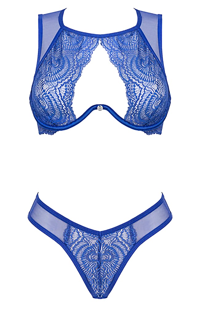 Beugel-bh en -panty set Giselia van Obsessive gemaakt van fijn koningsblauw kant gemengd met delicate powernet. Zacht en elastisch voor maximaal comfort. Stijlvolle bh met hoepels in de cup voor perfecte ondersteuning, de bandjes zijn verstelbaar zodat ze goed passen. Clip-sluiting aan de hals en op de rug. De bijpassende slip scoort met zijn geraffineerde snit, die benen en billen op een spannende manier benadrukt.
