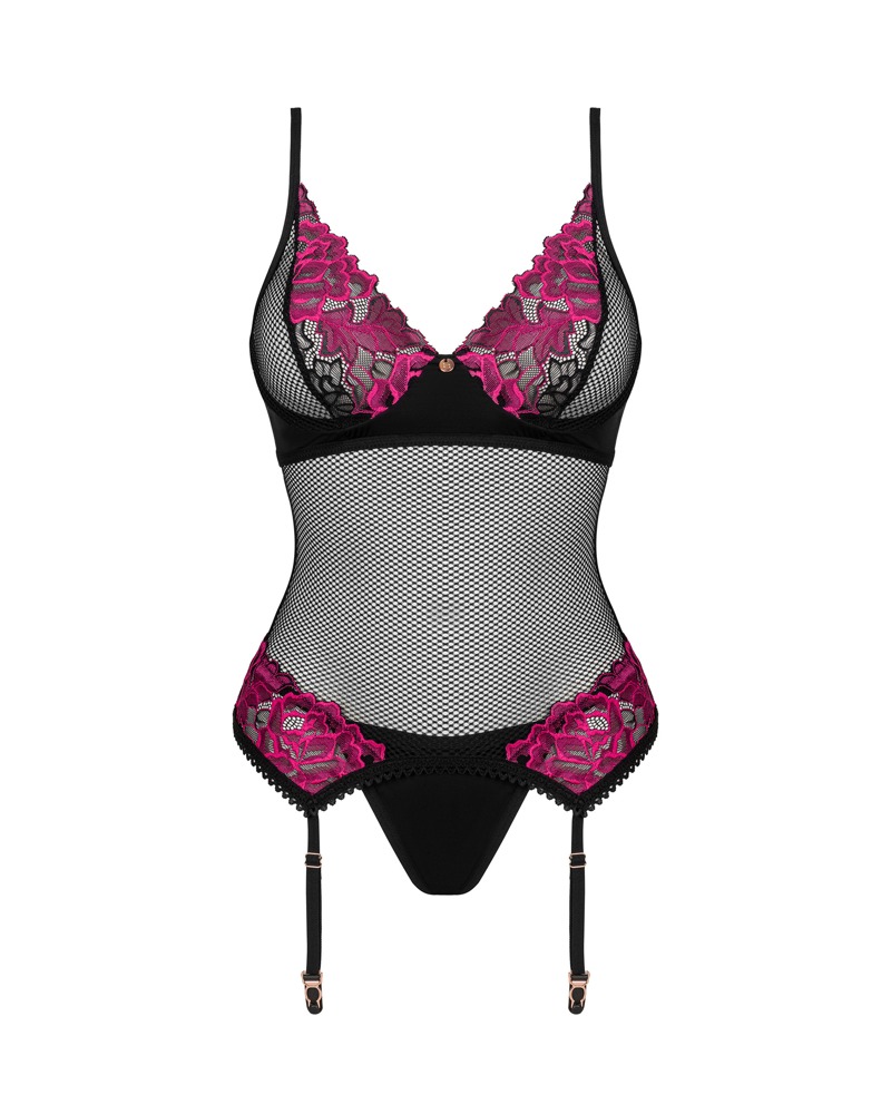 Elegant Rosenty setje van Obsessive met jarretelhemdje en string. Zacht zwart stretch mesh met fijn roze rozenkant op het decolleté en de heupen. Jarreteltop met een klein decoratief element tussen de beugelcups en verstelbare haaksluiting in het lage rugdecolleté. De bandjes en jarretelbandjes zijn ook verstelbaar. Wordt geleverd met een bijpassende ondoorzichtige riostring.