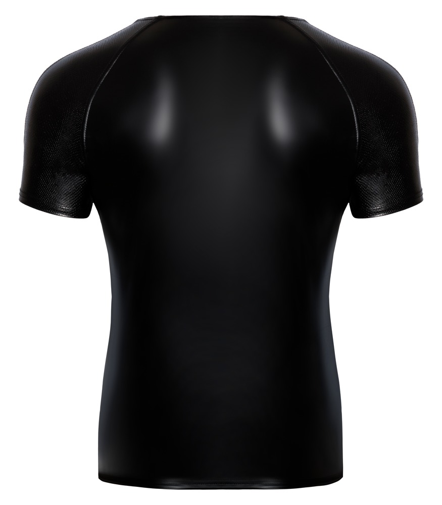 Opvallend shirt van Noir in zwarte matglanzende power wetlook. Korte mouwen en schouderpartij in iriserende slangenleerlook. Zacht en elastisch voor een aansluitende pasvorm en hoog draagcomfort.
