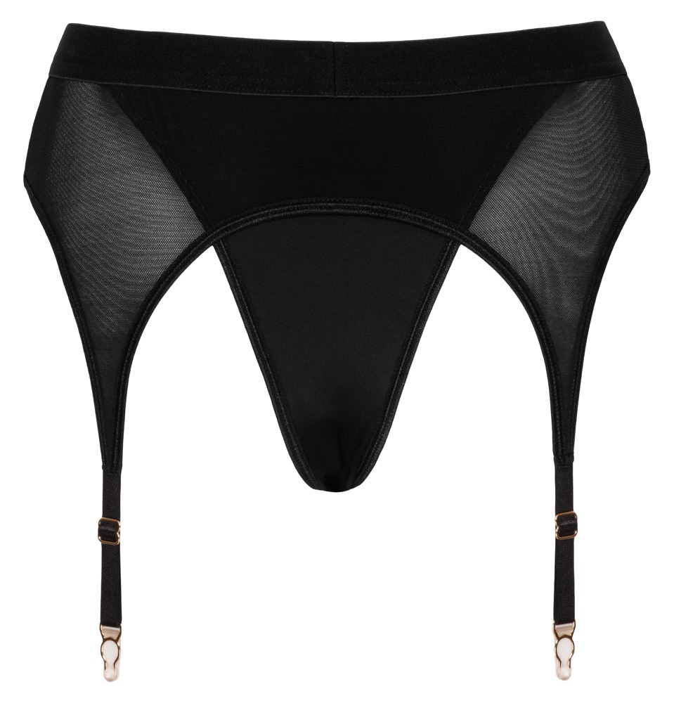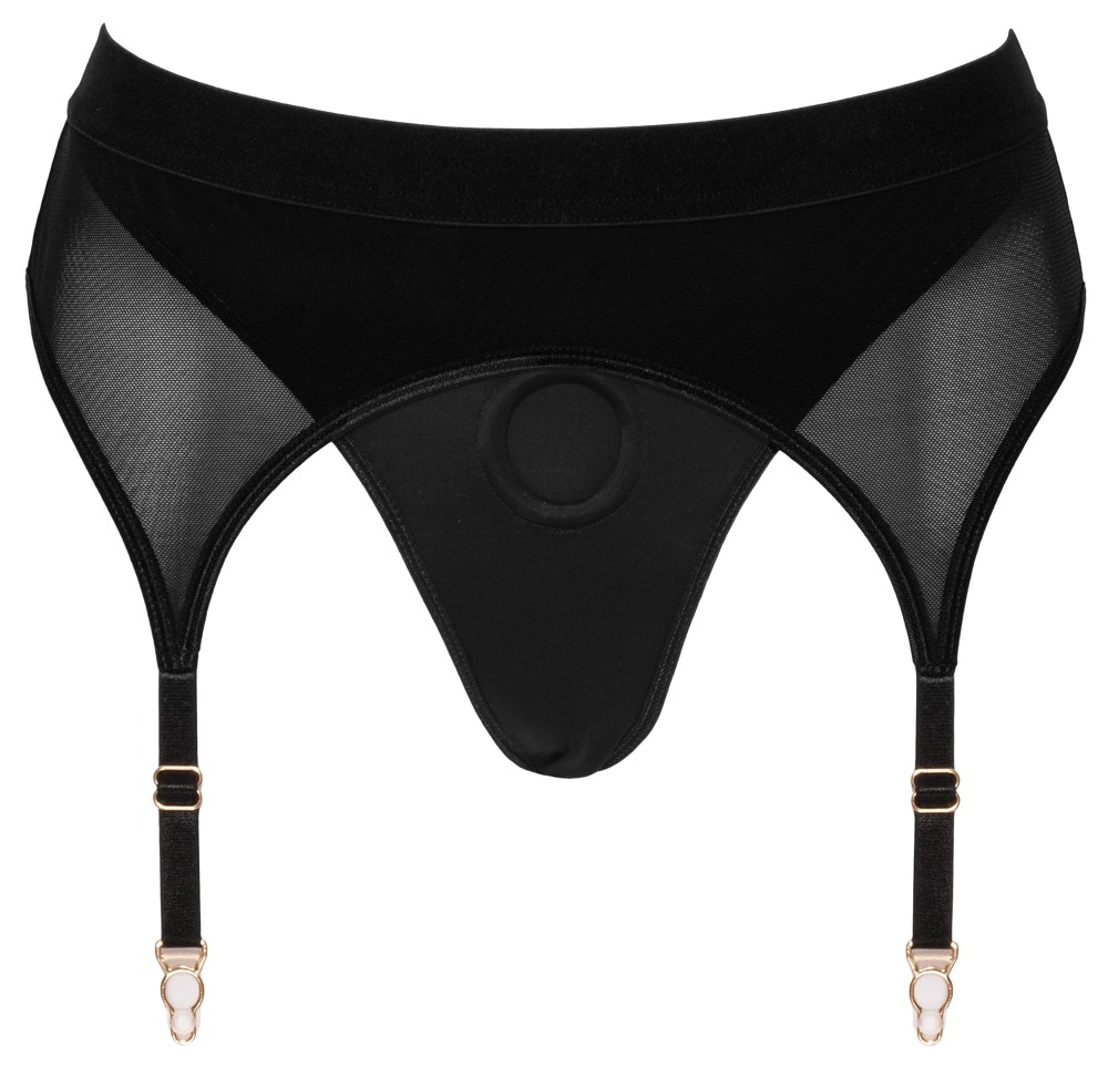 Zwarte voorbindstring van Bad Kitty van zachte microvezel gecombineerd met een jarretelgordel van zacht powernet. De string is dubbellaags aan de voorkant en heeft een split, evenals een zorgvuldig geïntegreerde rekbare houderring (Ø 3,5 cm) voor het inbrengen van een dildo/vibrator met een standaard/zuignap. De jarretelbandjes zijn verstelbaar.