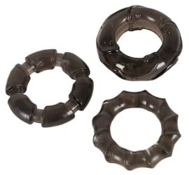 Zeer elastische penisringen trio met verschillende stimulans structuur en diameters. Binnendiameter 2,4-2,6 cm. Materiaal: TPE.