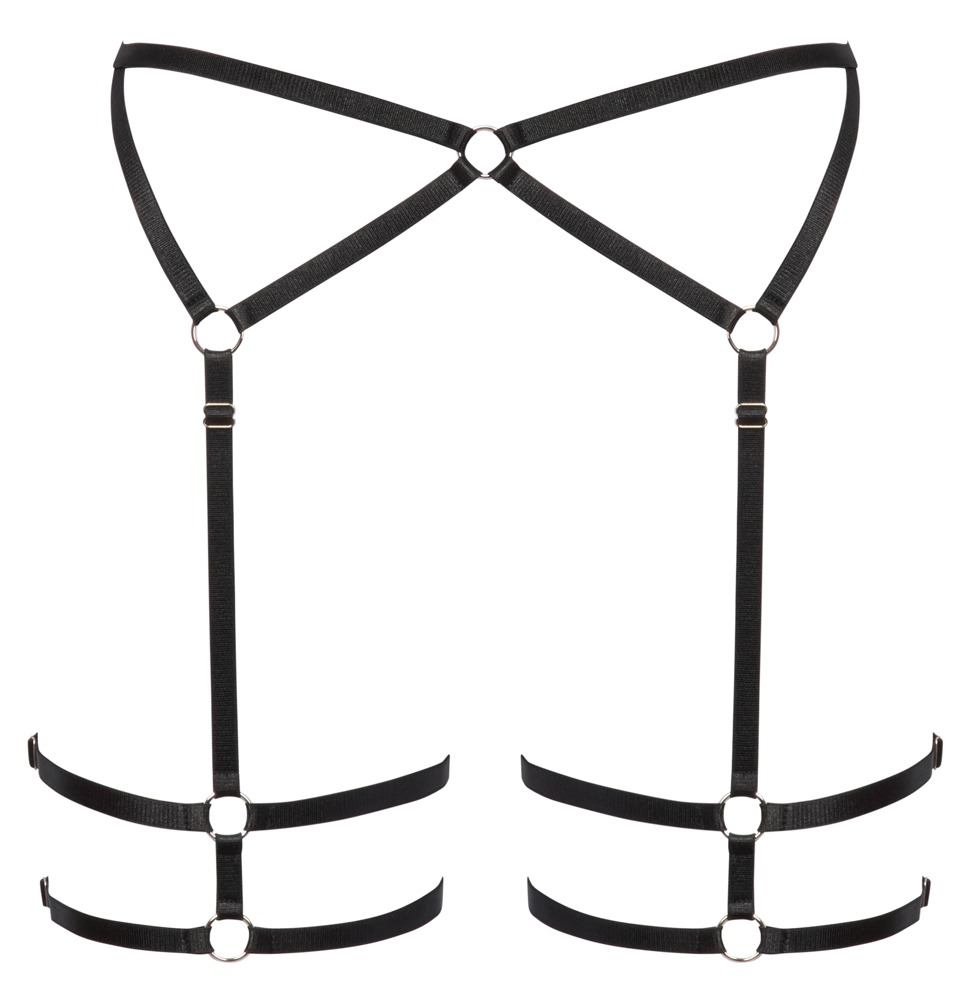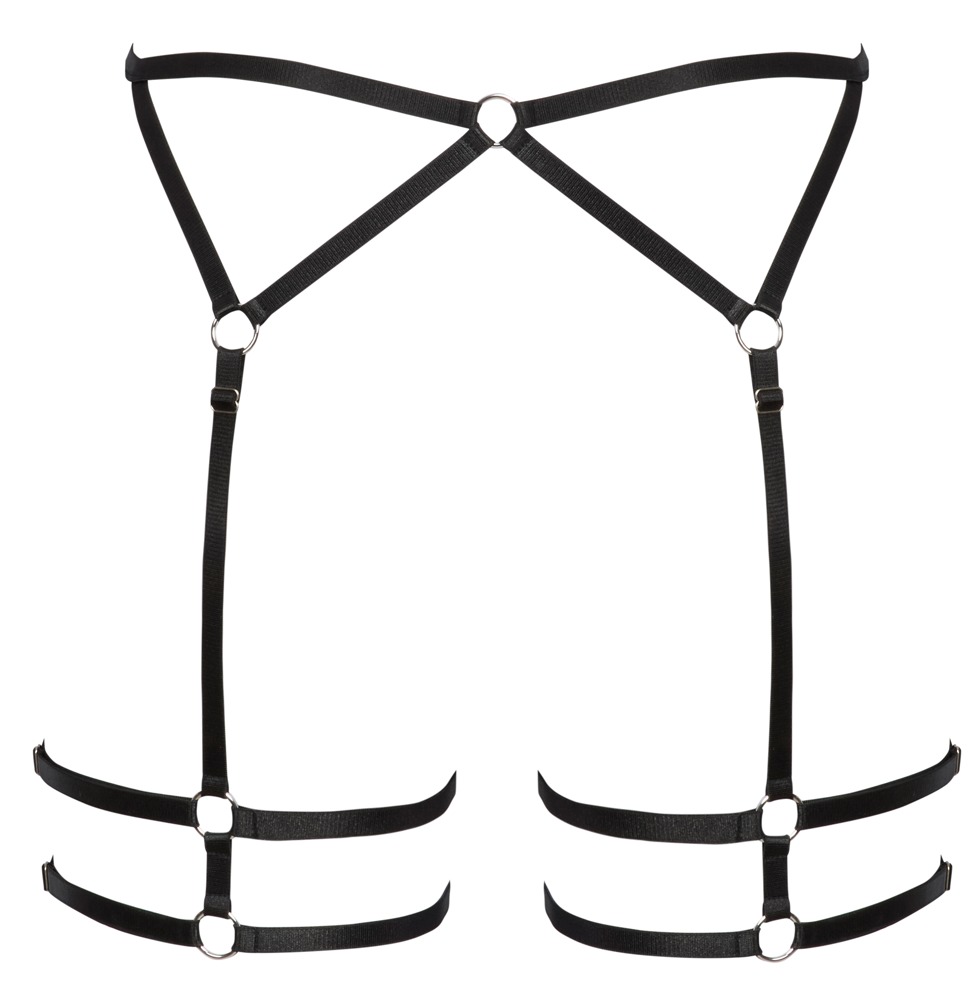 Dit zwarte harnas van Cottelli LINGERIE laat je taille, heupen en dijen op een spannende manier zien! Gemaakt van zachte, zijdeachtige, glanzende stretchbandjes en zilverkleurige verbindingsringen. De jarretelbandjes voor en achter en de dubbele dijbanden kunnen op maat worden versteld.