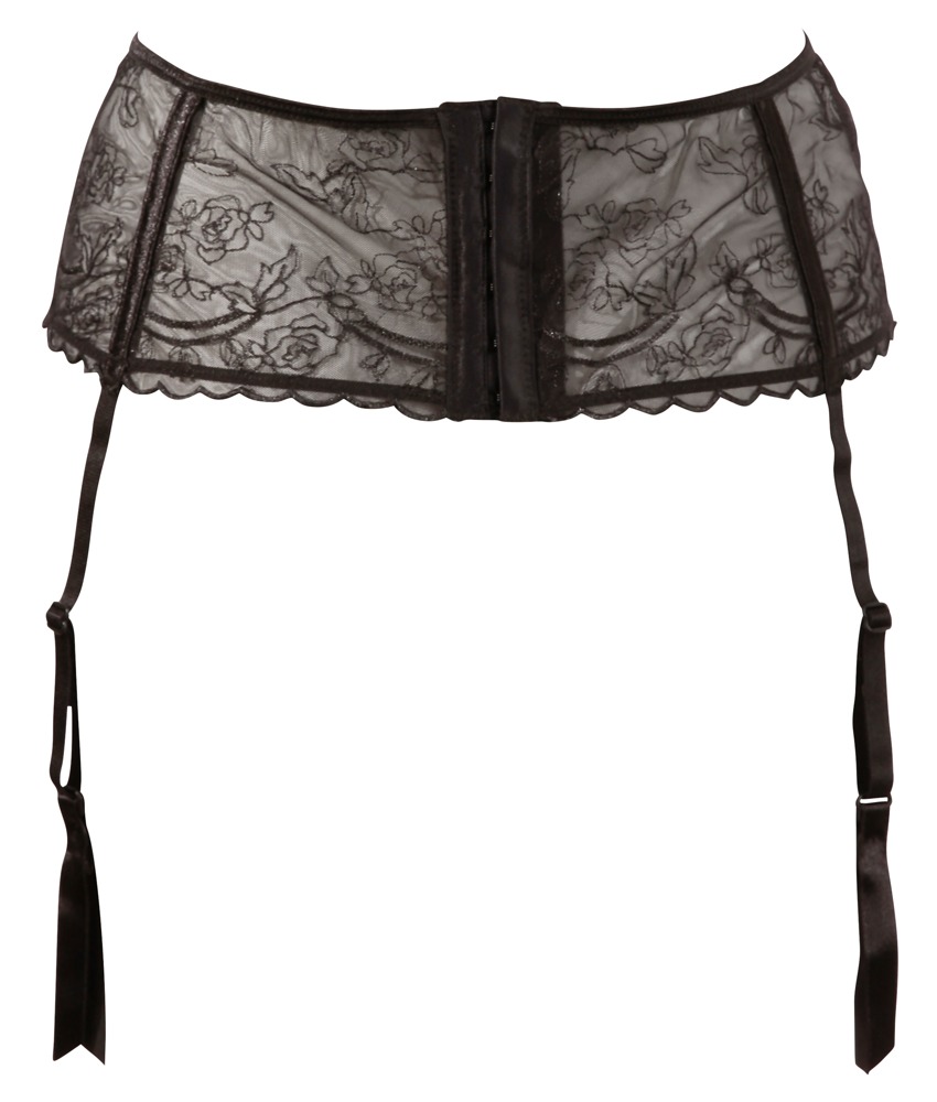 Jarretelgordel met vier verstelbare jarretels en 2-voudige haaksluiting. Zwart-transparant, delicaat geborduurd.