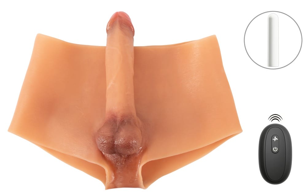 Bedrieglijk echt met vibro-kracht!nUltra Realistische Vibrerende Penis Broek van You2Toys met een absoluut realistische voorgevormde vibrerende penis en testikels. De bilplooi en rekbare anusopening maken de levensechte, realistische look compleet. Inclusief vibrator met afstandsbediening (bereik 8 meter) voor 10 vibratiestanden. De vibrator kan met zijn stevig voorgevormde eikel uit de penishuls worden gehaald. Hierdoor kan de broek ook zonder vibrator als penisverlenging gedragen worden. nnGemaakt van zijdezachte vloeibare siliconen ziet de penisbroek er niet alleen bijna uit als echte huid, hij voelt ook zo zacht aan. De broek is rondom voorzien van elastiek, sluit goed aan en is zeer comfortabel om te dragen.nnOplaadbare vibrator – inclusief USB-oplaadkabel en batterij (27A) voor de afstandsbediening.nnBroekje geschikt voor maat M.nRekbare omtrek: tailleband 54 cm, beenopening 46 cm; zijhoogte 17 cm. nPenis (dildo/mouw): Totale lengte 20,6 cm, inbrengdiepte 16,5 cm, Ø max. 4,1 cm.nAnusopening: Ø 2 cm (rekbaar).nVibrator: 12,8 cm lang, Ø max. 2,6 cm.nGewicht 888 g.nVloeibare siliconen, ABS (vibrator).