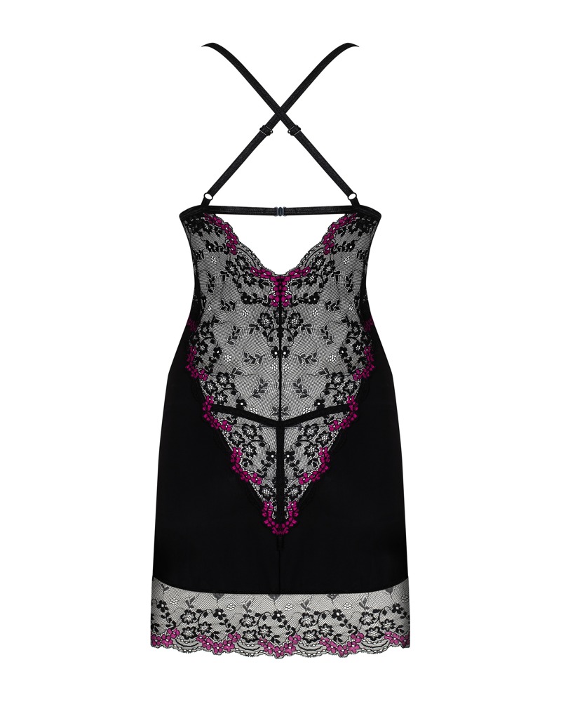 Aansluitende lingeriejurk en bijpassende string in de Vanessme set van Obsessive. In een geraffineerde mix van ondoorzichtig zwart stretchmateriaal en transparant 2-kleurig kant. Alles zacht en stretchy voor volledig comfort. Met zachte cups en haakjessluiting op de rug. De bandjes kruisen elkaar op de rug en kunnen op maat worden versteld.